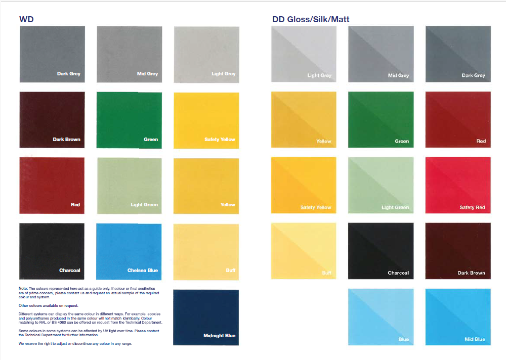All of the flooring systems that we install are available in a range of standard colours. (See colour chart) However, any RAL or BS colour can be manufactured to order to provide bespoke requirements, for example your corporate colours.